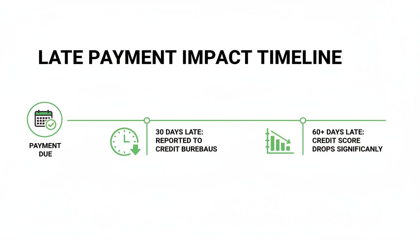 The real trouble begins when your payment is officially 30 days past due. This is the critical threshold when a creditor is allowed to report the delinquency, causing the first significant damage to your credit score. From there, the negative impact grows with each passing month: a 60-day late payment is more harmful than a 30-day one, and a 90-day late payment is even more destructive.